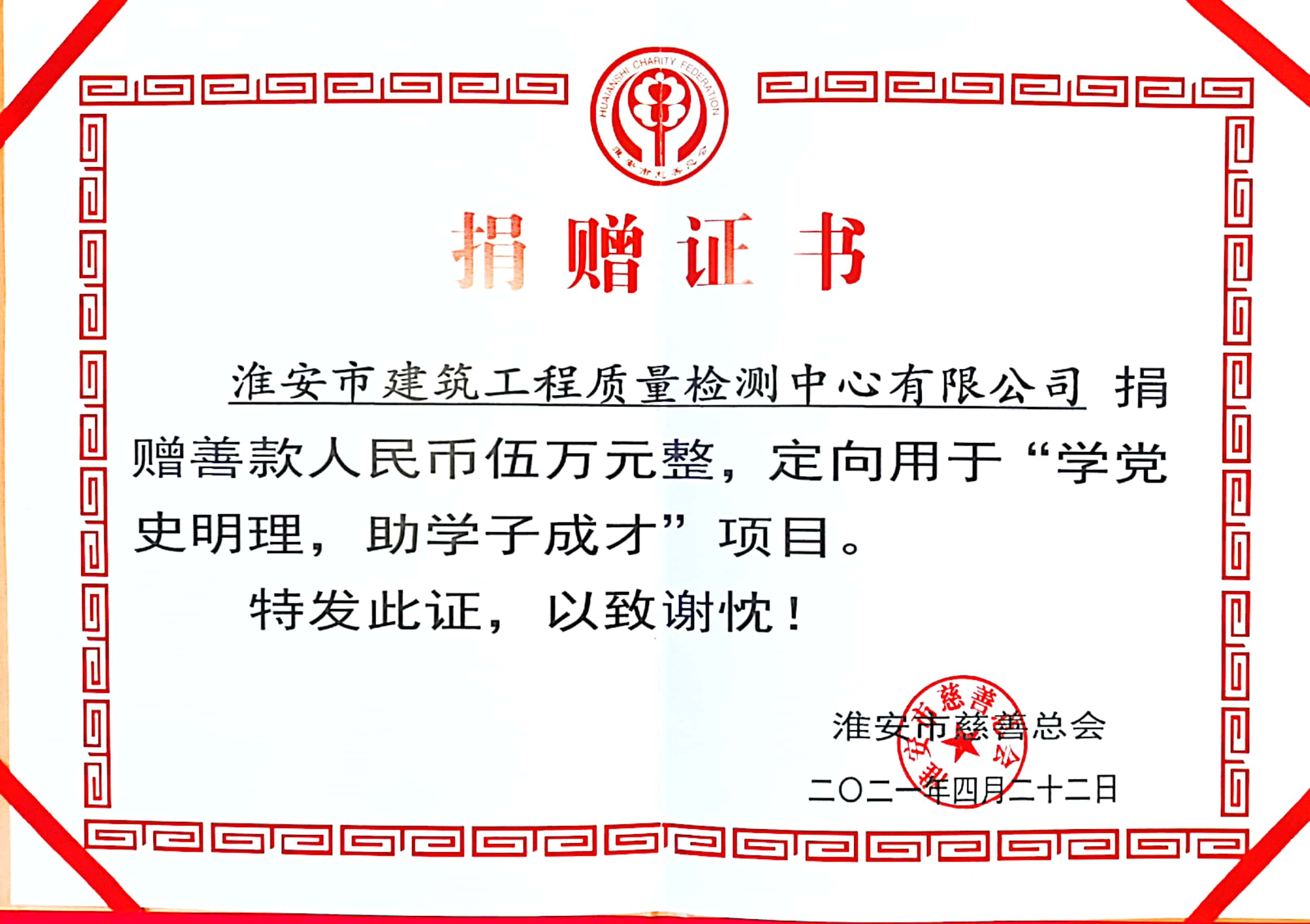 淮安市建筑工程質(zhì)量檢測中心有限公司在發(fā)展壯大的同時,努力扛起回報社會的責任,2021年4月22日向淮安市慈善總會捐資5萬元人民幣,定向捐贈“學黨史明理,助學子成才”項目。