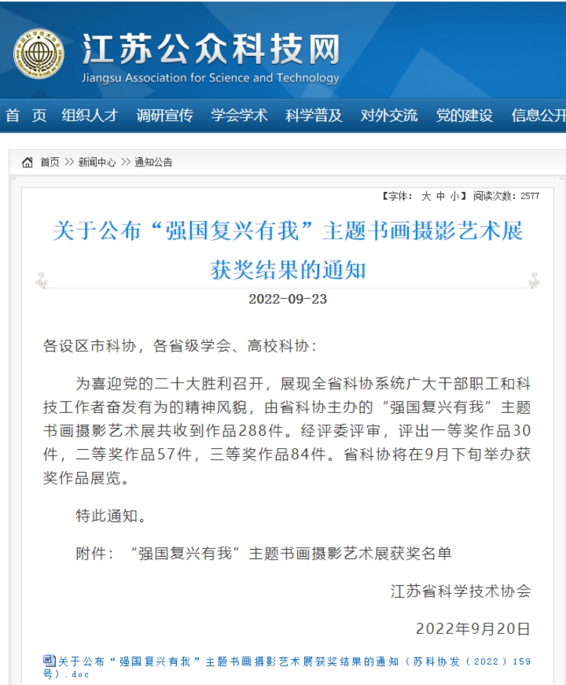 為喜迎黨的二十大,展現(xiàn)全省科技者奮發(fā)有為的精神風(fēng)貌,由江蘇省科學(xué)技術(shù)協(xié)會(huì)舉辦的“強(qiáng)國(guó)復(fù)興有我”主題書畫攝影藝術(shù)展活動(dòng)9月在寧開展,共有156件作品獲獎(jiǎng)。
