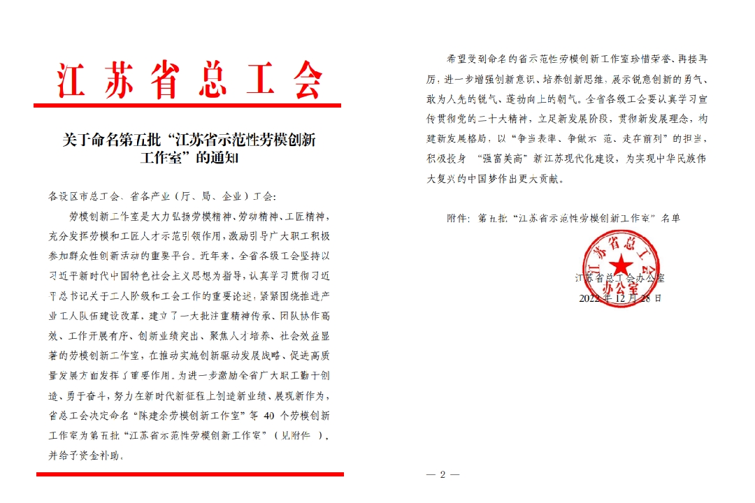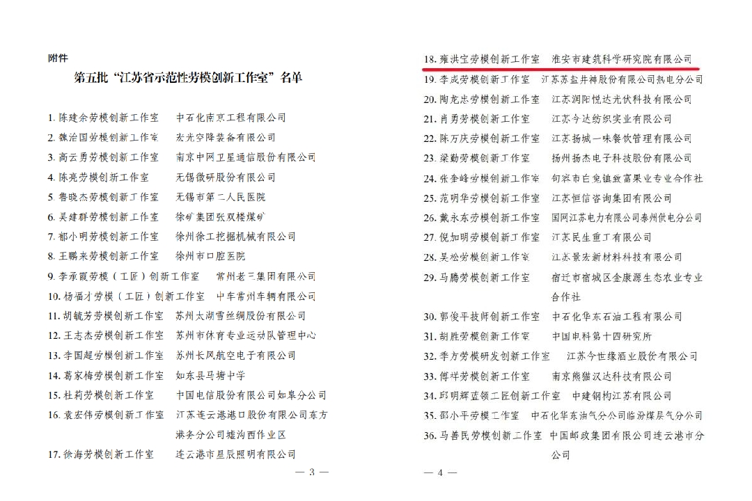 2022年12月28日,江蘇省總工會(huì)對(duì)第五批“江蘇省示范性勞模創(chuàng)新工作室”進(jìn)行了命名表彰,淮安市建筑科學(xué)研究院雍洪寶勞模創(chuàng)新工作室榜上有名。