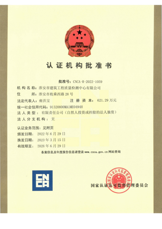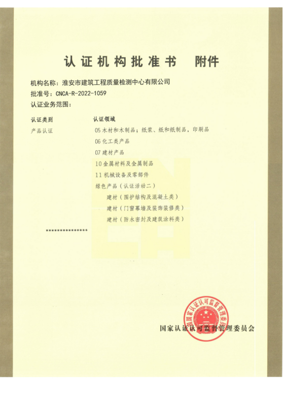 我公司持有國家認證認可監(jiān)督管理委員會頒發(fā)的《認證機構(gòu)批準書》(批準號:CNCA-R-2022-1059),可在全國范圍內(nèi)開展自愿性產(chǎn)品認證和綠色建材產(chǎn)品認證業(yè)務(wù),向獲證企業(yè)頒發(fā)綠色建材產(chǎn)品認證證書。
